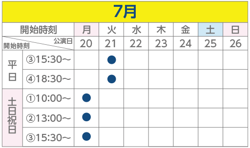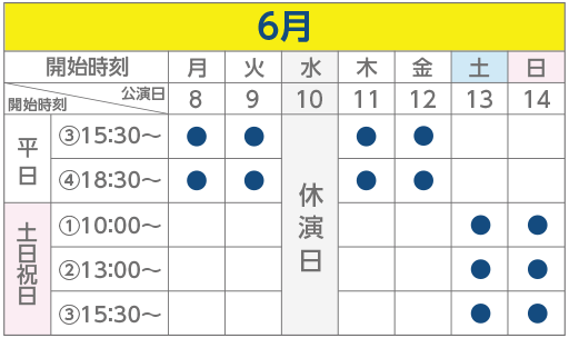 - 1回の公演時間は約1時間30分(内休憩10分)。